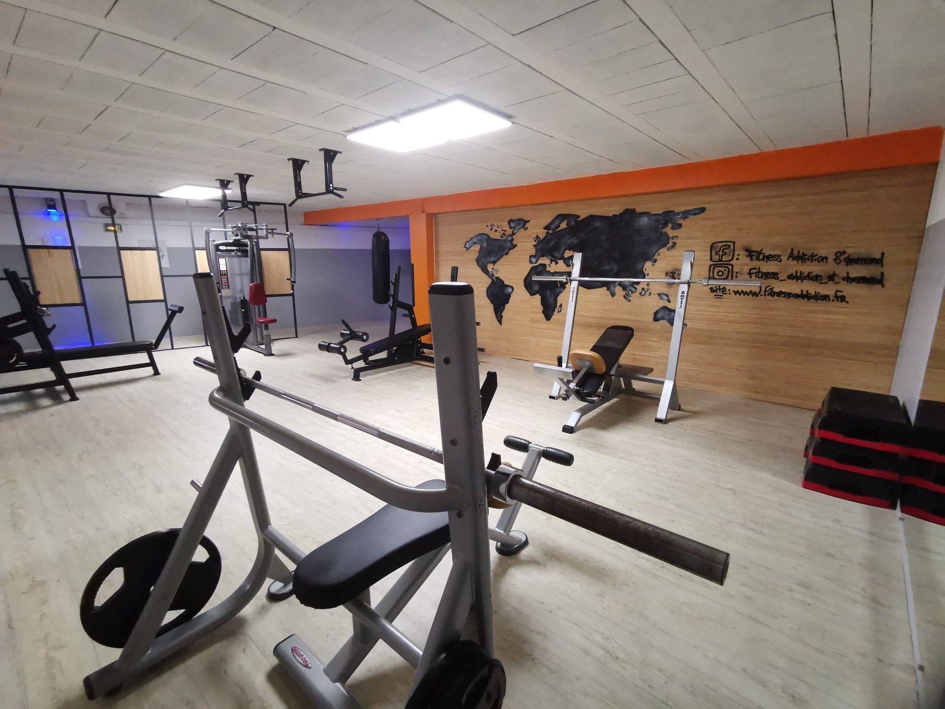 Vous y trouverez 2 étages entièrement équipés de machines de cardio , musculation et cross training . Ainsi qu'une salle de cours vidéo à votre entière disposition.